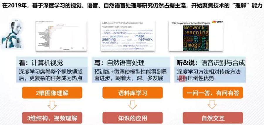 在2019年,基于深度學習的視覺、語音、自然語言處理等研究仍占據主流,人們開始聚焦技術的“理解”。