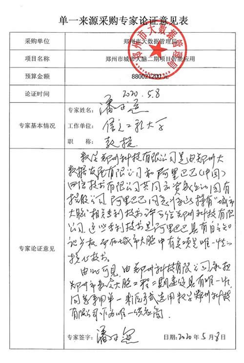 2020年5月8日,《鄭州市城市大腦二期項目智能應用單一來源采購公示》發布,預算88002.12萬元,數字鄭州科技有限公司擬取得供應商資格。