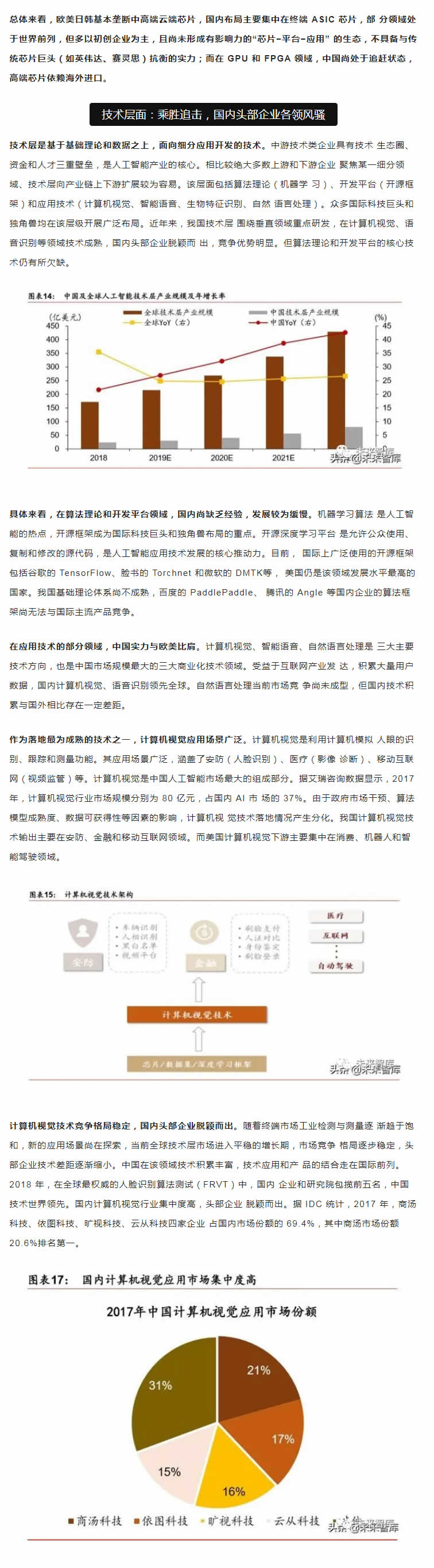 國(guó)內(nèi)人工智能追趕速度迅猛,但基礎(chǔ)薄弱問(wèn)題突出。在強(qiáng)有力的戰(zhàn)略引L和政策支持下、 依托龐大的數(shù)據(jù)體量、豐富的應(yīng)用場(chǎng)景和G度的互聯(lián)網(wǎng)普及率,中國(guó)人工智能產(chǎn)業(yè)持續(xù)保 持蓬勃發(fā)展態(tài)勢(shì),并躋身人工智能D一梯隊(duì)。技術(shù)上,我國(guó)人工智能論文和專利申請(qǐng) 量長(zhǎng)期雄踞世界首位,在國(guó)際技術(shù)競(jìng)賽中多次拔得頭籌;產(chǎn)業(yè)上,以阿里巴巴、騰訊為代 表的科技巨頭多面布局人工智能生態(tài),以寒武紀(jì)、科大訊飛、商湯科技為代表的初創(chuàng)企業(yè) 深耕垂直L域,打造技術(shù)護(hù)城河。我國(guó)人工智能產(chǎn)業(yè)規(guī)模、資本投入、企業(yè)數(shù)量呈現(xiàn)爆發(fā) 式增長(zhǎng),智能技術(shù)與實(shí)體融合持續(xù)加強(qiáng),落地場(chǎng)景不斷豐富。但我們也應(yīng)當(dāng)意識(shí)到,與美 國(guó)、歐洲相比,我國(guó)在產(chǎn)業(yè)鏈分布上更加集中于應(yīng)用落地端口。長(zhǎng)期市場(chǎng)化導(dǎo)向?qū)е聡?guó)內(nèi) 行業(yè)發(fā)展出現(xiàn)結(jié)構(gòu)性失衡,基礎(chǔ)理論缺乏、原創(chuàng)算法薄弱、G端芯片依賴進(jìn)口等問(wèn)題凸顯, 這也反映出中國(guó)人工智能發(fā)展不牢的風(fēng)險(xiǎn)點(diǎn)。因此,站在科技創(chuàng)新的“巨型風(fēng)口”,我們 更需要審慎后續(xù)技術(shù)路線和產(chǎn)業(yè)發(fā)展路徑,加大科研攻關(guān)力度,補(bǔ)齊技術(shù)短板。