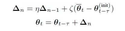 在基于 BMUF 的訓練框架下,假設我們總共有 N 個并行工作機,一個工作機可以是一塊或多塊 GPU 卡,也可以是一個計算節(jié)點。給定一個包含 Nτ 個 minibatch 的訓練數(shù)據(jù)子集,首先我們將這些數(shù)據(jù)均勻分布到 N 個并行工作機,每臺工作機獲得 τ 個 minibatch。從一個共同的初始模型 θ_(t-τ)^((init)) 開始,N 個工作機獨立更新各自的局部模型 τ 步,得到 {θ_(t,1),θ_(t,2),…,θ_(t,N)},對局部模型取平均得到 θ ̅_t。這一過程稱之為數(shù)據(jù)塊內(nèi)并行優(yōu)化(Intra-Block Parallel Optimization, IBPO)。與直接將 θ ̅_t 作為全局模型不同,BMUF 技術將歷史更新信息與當前更新信息結合,得到全局模型: