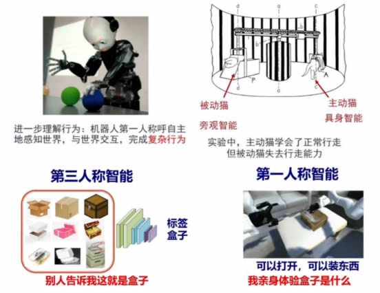 智能受腦、身體與環境協同影響,側重智能體與環境的“交互”,利用行為實現學習。從認知的角度來看,人類為D一人稱 視角的智能,以1963年的一個實驗為例,被綁起來的貓,只能看這個世界,是一種旁觀的智能;另一只貓可以主動去探索,是 具身的智能。前者有點像現在基于大量數據的智能,比如我們給機器很多盒子,并且標注這就是盒子,然后機器就會覺得這種 pattern 是盒子,屬于第三人稱的智能,而我們人類是通過體驗才知道的。具身智能基于智能體具身行為的學習機制可以將數據 的采集、模型的學習融為一體,真正實現主動交互的學習,這也是對人類學習過程的更G級模擬。