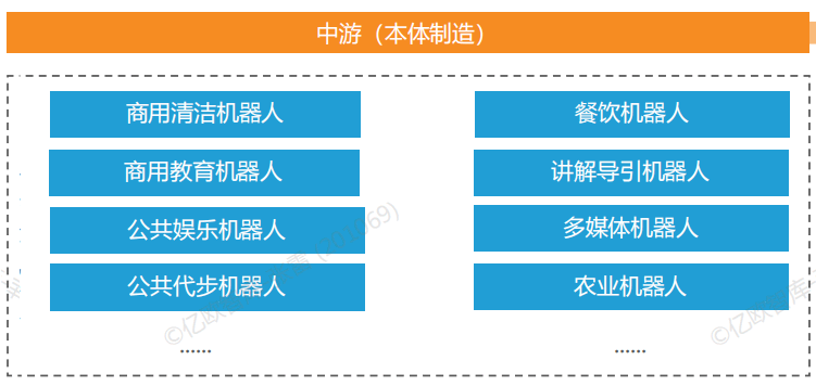 公共服務機器人產業鏈可分為,上游核心零部件、軟件系統開發、中游機器人本體制造、下游機器人分銷商與各場景商業用戶。