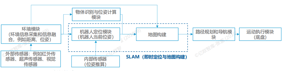環(huán)境感知模塊的基礎(chǔ)硬件是各類不同的傳感器,他們充當(dāng)了機(jī)器人的五官,收集不同的測量信息;SLAM算法(Simultaneous Localization and Mapping)用于融合收集的信息數(shù)據(jù),以確定機(jī)器人在未知環(huán)境中的位置,并構(gòu)建一張環(huán)境地圖,通過SLAM技術(shù)機(jī)器人可以在未知環(huán)境中進(jìn)行自主探索和導(dǎo)航。