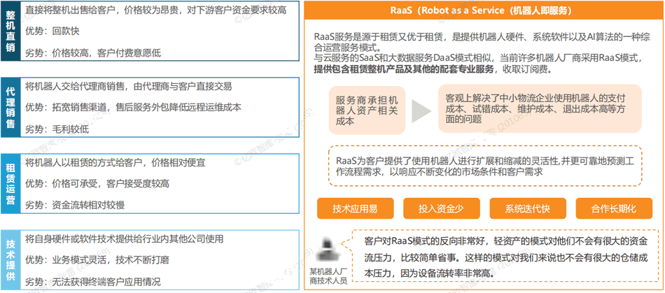 目前服務(wù)機(jī)器人廠商商業(yè)模式主要為五類:直銷、分銷、租賃、技術(shù)授權(quán)、RaaS