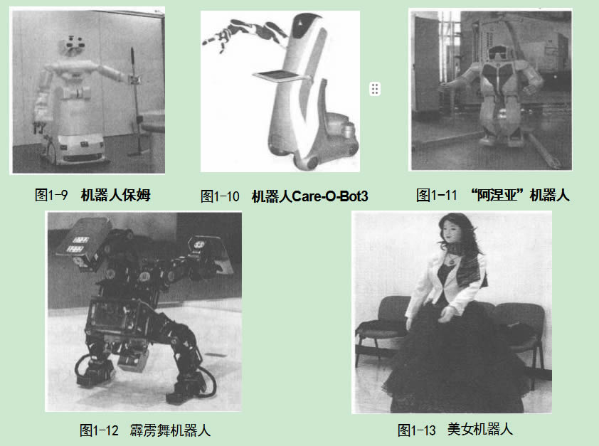 圖1-13所示機器人是一款完全由我國科學家自主研發成功的“美女機器人”,它不僅能 夠與人進行對話,還能夠根據自身攜帶的傳感器進行自主運動。這款“美女機器人”擁有靚 麗的外形,還能根據人的語音指令快速做出反應。