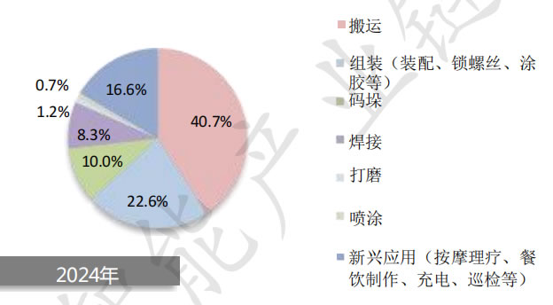 2023 年以前,協(xié)作機(jī)器人搬運(yùn)應(yīng)用長期占據(jù)市場 50%以上的份額。協(xié)作機(jī)器人被質(zhì)疑在工業(yè)場景是否只能勝任簡單重復(fù)的搬運(yùn)應(yīng)用,其市場主戰(zhàn)場是否不是工業(yè)領(lǐng)域而是想象空間更大 的非工業(yè)領(lǐng)域。 2023-2024 年 , 以華沿機(jī)器人(HUAYAN)、節(jié)卡(JAKA)為的國產(chǎn)協(xié)作機(jī)器人廠商紛紛加速強(qiáng)化工藝包,突破復(fù)雜工藝瓶頸,推出可以用于組裝、焊接、碼垛等場景的工藝型協(xié)作機(jī)器人工作站,并得到終端客戶的認(rèn)可,在垂直細(xì)分領(lǐng)域快速滲透。如圖 19 所示,2024年工藝型應(yīng)用市場份額已超過搬運(yùn),且仍在加速增長中。