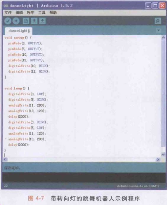 相應地,這4條語句是讓右燈熄滅,左燈點亮,同時機器人向左轉彎(逆時針轉方向圓 圈)了。