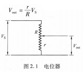電位器是Z簡單的位置傳感器,如圖2.1所示。電位器通 過電阻把位置信息轉(zhuǎn)化為隨位置變化的電壓,通過檢測輸出電 壓的變化確定以電阻中心為基準(zhǔn)位置的移動距離。當(dāng)電阻器 上的滑動觸頭隨位置變化在電阻器上滑動時,觸頭接觸點(diǎn)變化 前后的電阻阻值與總阻值之比就會發(fā)生變化。在功能上,電位 器充當(dāng)了分壓器的作用,因此輸出電壓Vout 與可變電阻r 成 比 例,即