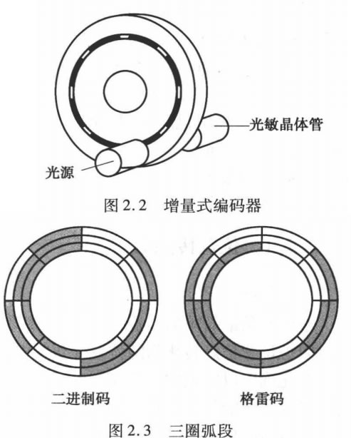 (1)增量式光電編碼器。如圖2.2所示,增量式光 電編碼器由光源、碼盤、光敏晶體管組成,碼盤上有透 光和不透光的弧段,尺寸相同且交替出現(xiàn)。由于所有的 弧段尺寸相同,每段弧所表示的旋轉(zhuǎn)角相同,碼盤上的 弧段越多,精度越高,分辨率就越高。當(dāng)光旋轉(zhuǎn)通過碼 盤上弧段時,輸出連續(xù)的脈沖信號,對這些信號計數(shù),就 能計算出碼盤轉(zhuǎn)過的距離。