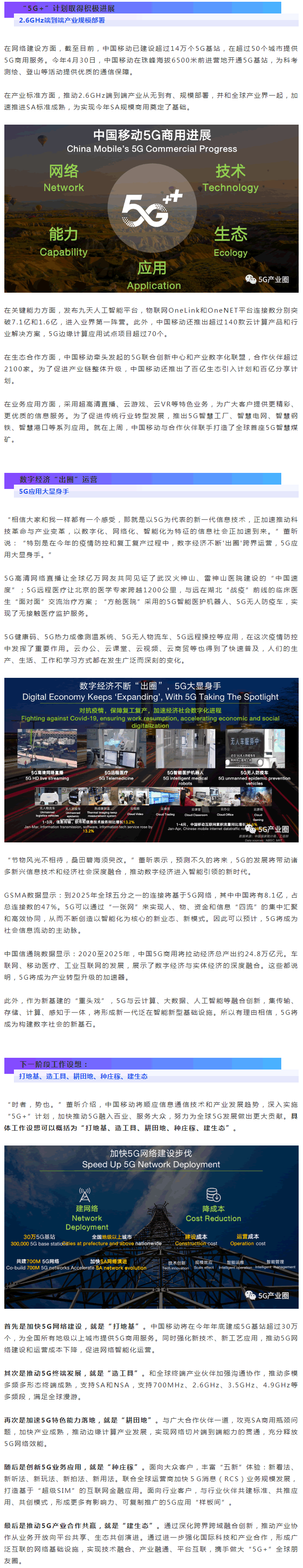 中國移動將通過“打地基、造工具、耕田地、種莊稼、建生態”,深入實施“5G+”計劃,加快推動5G融入百業、服務大眾。