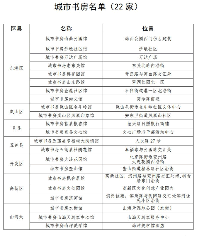 環衛所城市書房(環翠路南段,興業新營華府西門) 運總集團城市書房(黃海二路11號) 石臼街道城市書房(黃海一路與海濱五路交匯處) 開發區中心公園城市書房(天津路72號)