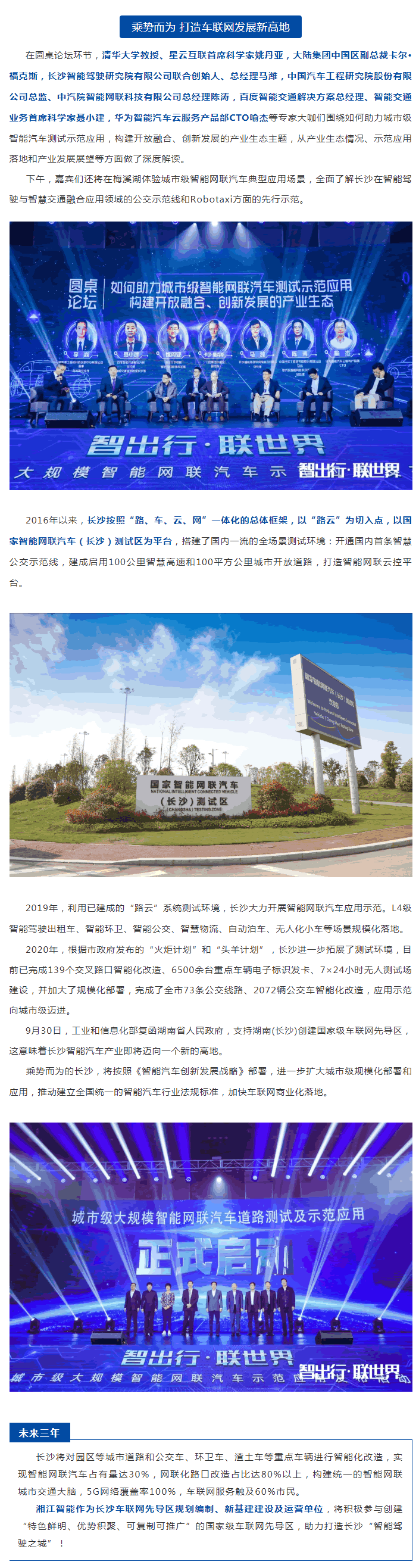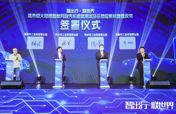 長沙市、株洲市、湘潭市、岳陽市工業和信息化局共同簽署了《城市級大規模智能網聯汽車道路測試及示范應用共建倡議書》。