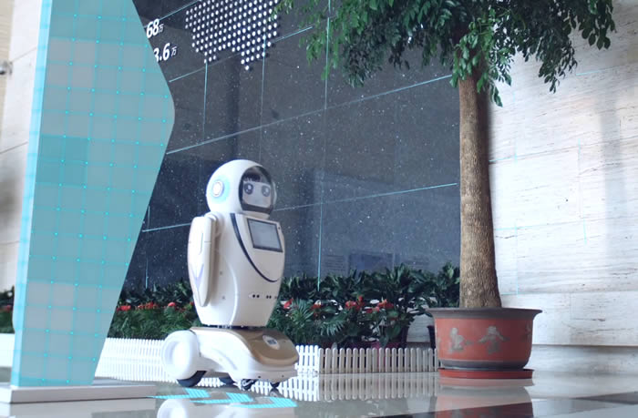一名前臺機器人接待員便主動迎上前來,詢問你的來訪目的,為你做信息登記,向你介紹基本情況,對一些問詢做出基本回答,提供更多智能化服務