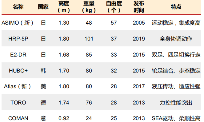 群雄并起,逐鹿人形機器人。日韓在人形機器人L域布局早,研究表現活躍;美國在人形機器人L域后來居上。波士頓動力研發(fā)的代表產品Atlas身G1.8m,體重80kg,具有28個關節(jié),可完成原地起跳轉身一周等流暢、G難度的“跑酷”動作,但主