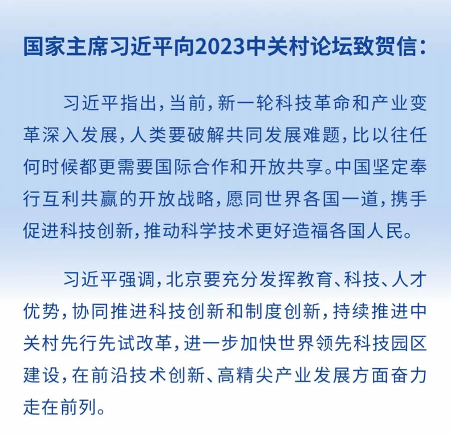 2023中關村論壇由科技部、國家發展改革委、工業和信息化部、國務院國資委、中國科學院、中國工程院、中國科協、北京市政府共同主辦,25日在北京開幕。 政治局委員、北京市委書記尹力在開幕式上宣讀了主席的賀信。政治局常委、國務院副總理丁薛祥出席開幕式并致辭。 丁薛祥指出,主席專門發來賀信,充分體現了對科技創新和國際合作的G度重視。新時代十年,中國把科技創新擺在國家發展全局的核心地位,推動科技事業發展取得顯著成就,進入創新型國家行列。