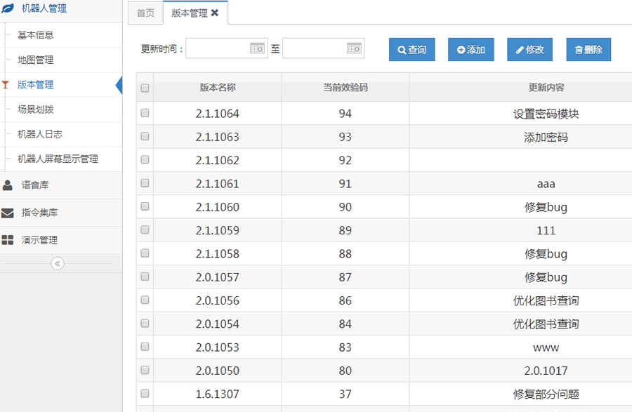 迎賓機(jī)器人管理的功能是對用戶使用的機(jī)器人信息進(jìn)行管理,包括機(jī)器人基本屬性的配置,以及相關(guān)信息的常規(guī)操作,增刪改查等功能。