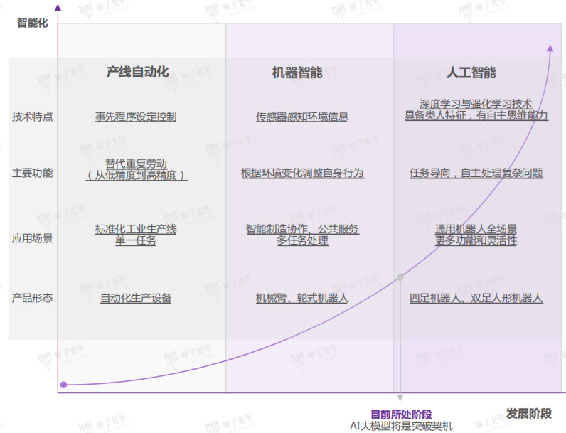 憑借機器視覺,自然語言理解等人工智能技術的發展,初代“AI+”機器人產品逐步成熟,生成式AI的爆發與通用人工智能的曙光